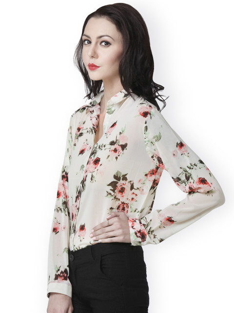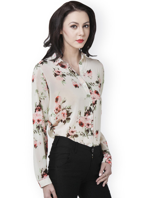 Beige women shirt, has contrast floral print throughout, a spread collar, long sleeves with button cuffs, a full button placket on the front, gathers below the back yoke