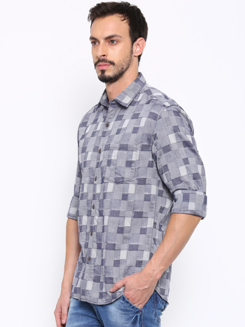 Blue self-design casual shirt, has a spread collar, button placket, long sleeves, a chest pocket, curved hem