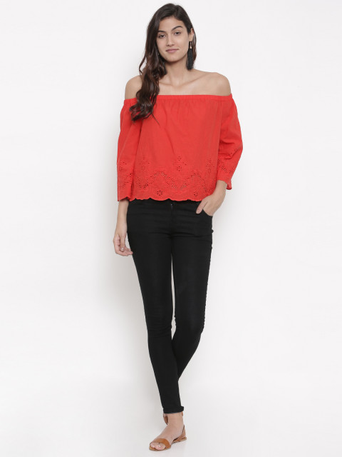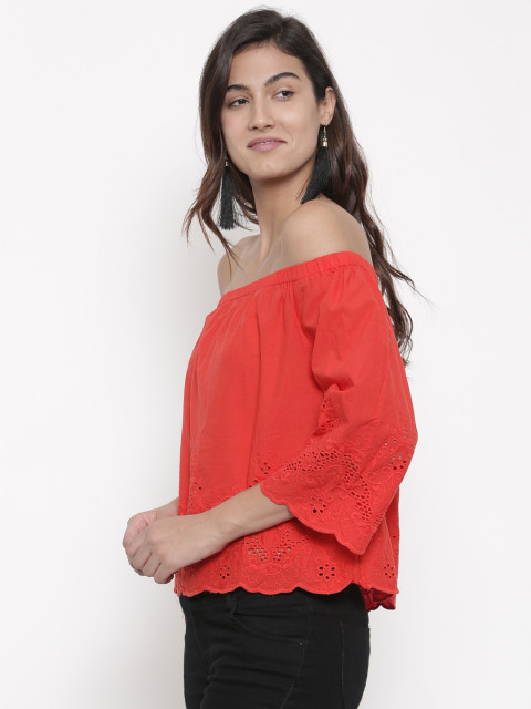 Red self-design woven bardot top, has an off-shoulder styling, three-quarter sleeves