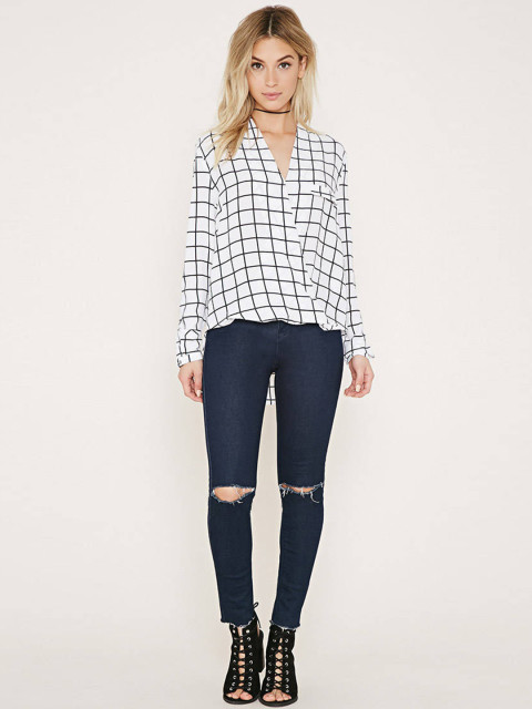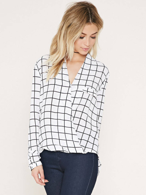 White and black checked woven wrap top, has a V-neck, long cuffed sleeves,a flap detail on the front, and a high-low hemline