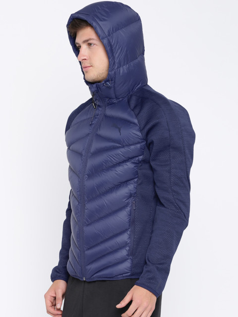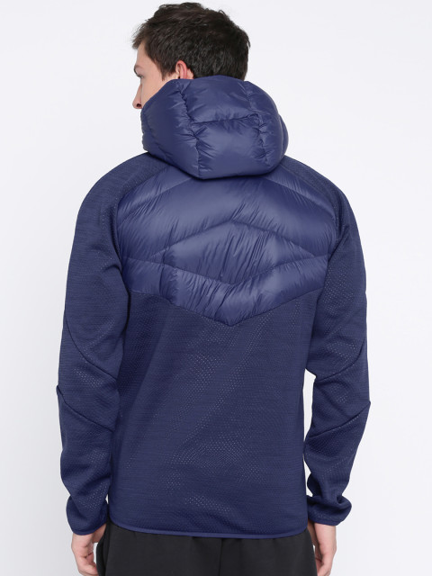 Blue solid puffer jacket, has a hooded, 2 pockets, zip closure, long sleeves, straight hem, synthetic lining
