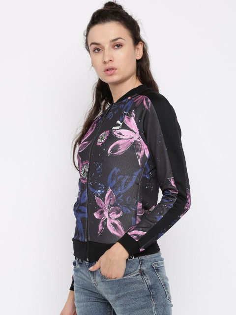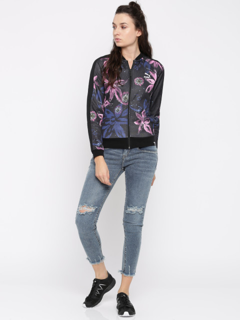 Black printed bomber jacket, has a mandarin collar, 2 pockets, zip closure, long sleeves, straight hem, unlined lining