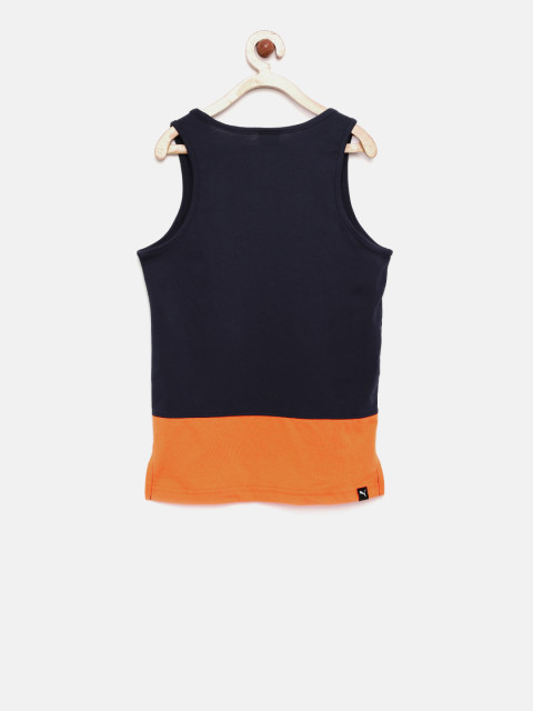 Navy blue and orange printed layered T-shirt, has a round neck, sleeveless