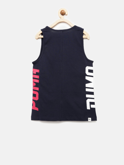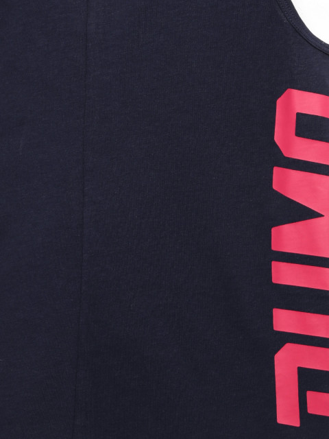 Navy blue printed tank top, has a round neck, sleeveless, a racer back. Engineered with dry technology