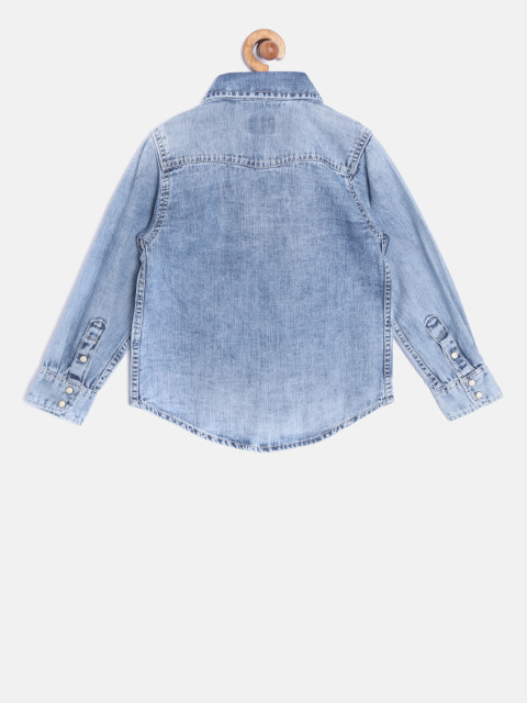 Blue faded denim casual shirt, has a spread collar, snap-button placket, 2 pockets, long sleeves, curved hem