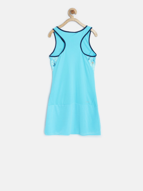 Blue knitted panelled drop-waist dress, has a round neck, sleeveless with a racerback, layered panelling along the hem with a crossover slit on one side. Engineered with climalite and UPF 50+ technologies. Warranty 3 months from the date of purchase against manufacturing defects.