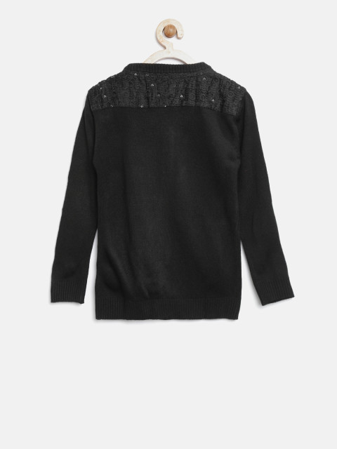 Black solid cardigan with lace inserts, has a V-neck, a full button placket, long sleeves, two pockets, ribbed hem