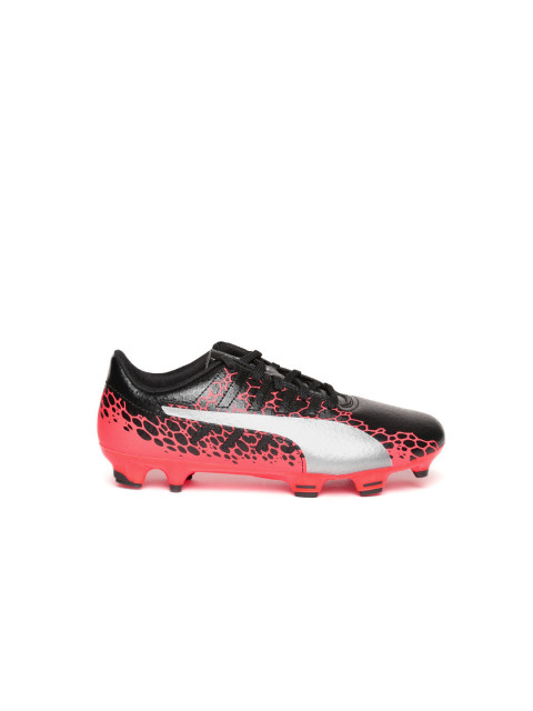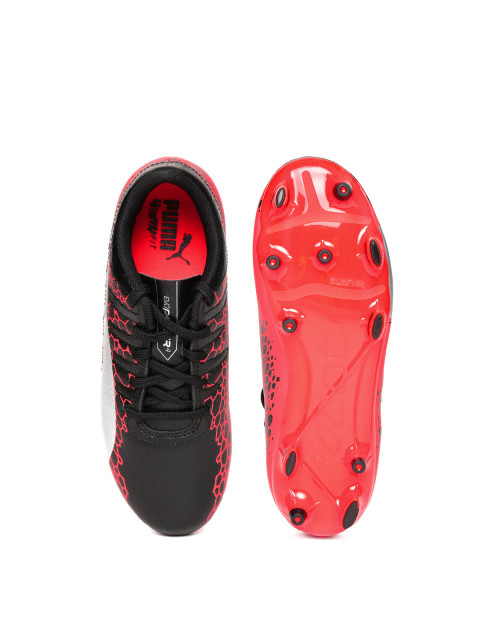 A pair of black and red football sports shoes, has lace-up detail. Synthetic printed upper, engineered with evoPOWER technology, cushioned footbed, textured and patterned outsole, engineered with DUOflex technology, has cleats. Warranty for 3 months. Warranty provided by Brand Owner or Manufacturer
