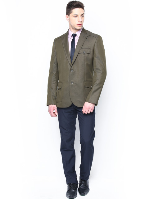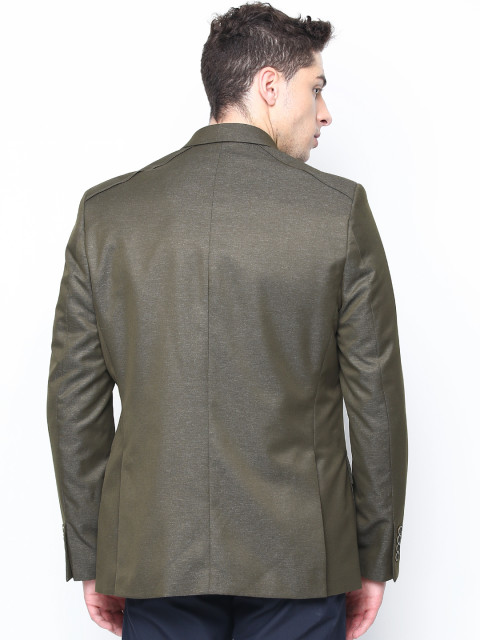 Olive green woven blazer, has a notched lapel, long sleeves with buttoned detail on the hems, single-breasted with double button closures on the front, lightly padded on the shoulders, a welt pocket with flap-and-button closure on the left side of the chest, a welt pocket with button-and-flap closures on either side of the front waist, panelled back, two slits on the back hem, and an attached lining with two built-in welt pockets on the left side, and a built-in welt pocket with flap-and-button closure on the right side
