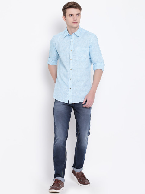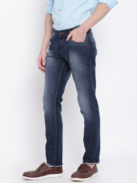 Navy blue dark wash 5 pocket mid rise jeans, clean look with light fade, has a button and zip closure, waistband with belt loops