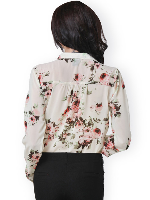 Beige women shirt, has contrast floral print throughout, a spread collar, long sleeves with button cuffs, a full button placket on the front, gathers below the back yoke