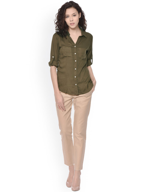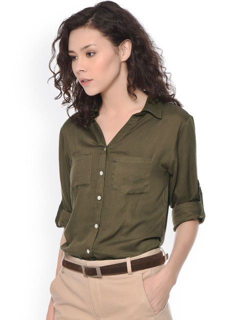Olive green solid casual shirt, has a spread solid, button placket, long sleeves with roll-up tab features, two patch pockets, curved hem