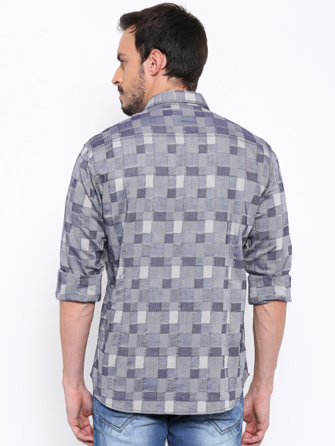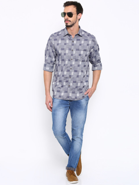 Blue self-design casual shirt, has a spread collar, button placket, long sleeves, a chest pocket, curved hem