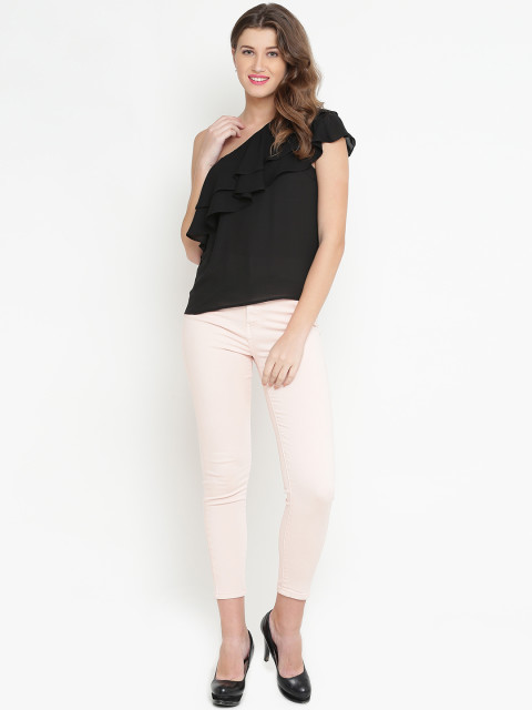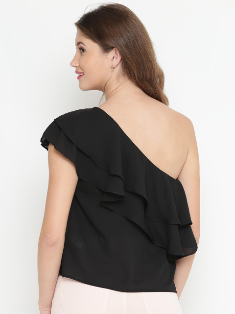 Black solid woven one-shoulder top, has layered detailing