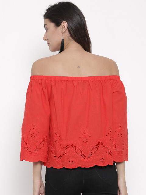 Red self-design woven bardot top, has an off-shoulder styling, three-quarter sleeves
