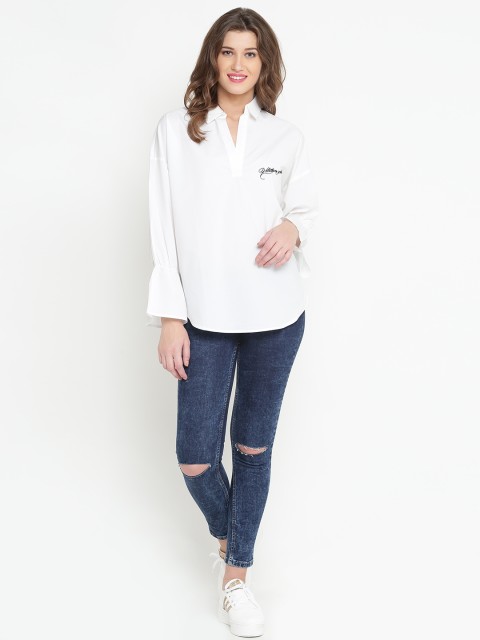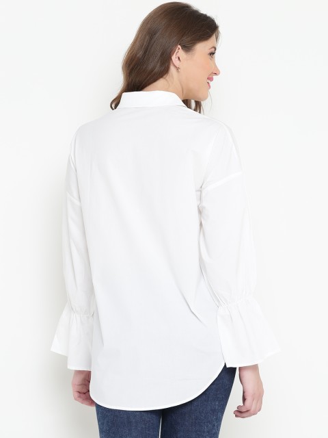 White solid woven shirt style top, has a shirt collar, long sleeves, curved hem