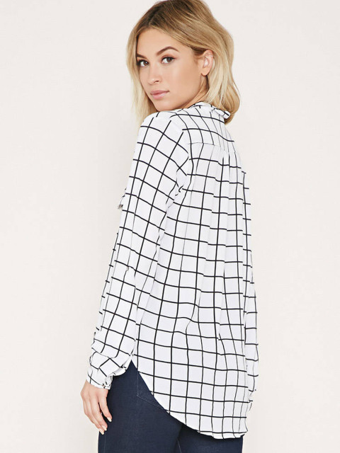 White and black checked woven wrap top, has a V-neck, long cuffed sleeves,a flap detail on the front, and a high-low hemline