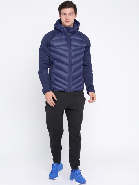 Blue solid puffer jacket, has a hooded, 2 pockets, zip closure, long sleeves, straight hem, synthetic lining
