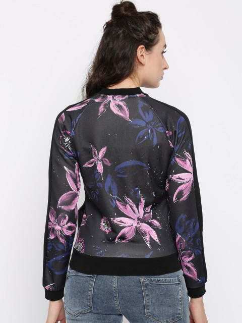 Black printed bomber jacket, has a mandarin collar, 2 pockets, zip closure, long sleeves, straight hem, unlined lining