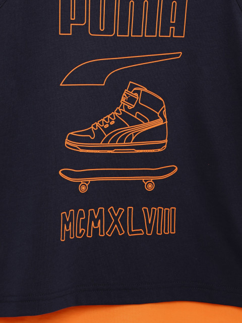Navy blue and orange printed layered T-shirt, has a round neck, sleeveless