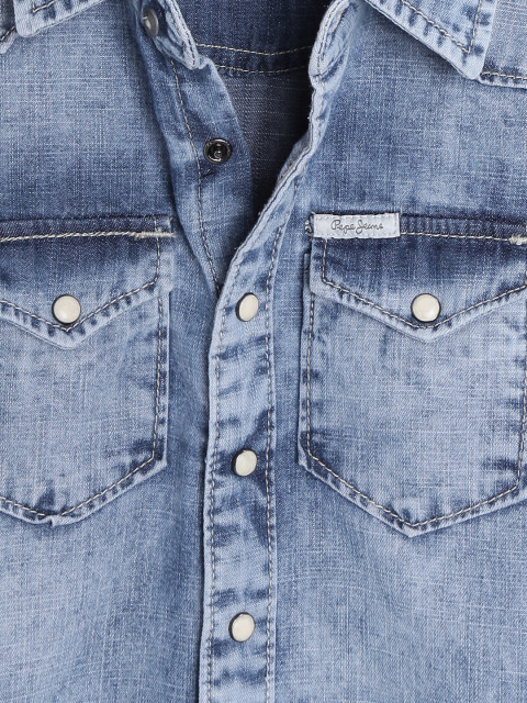 Blue faded denim casual shirt, has a spread collar, snap-button placket, 2 pockets, long sleeves, curved hem