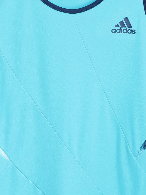 Blue knitted panelled drop-waist dress, has a round neck, sleeveless with a racerback, layered panelling along the hem with a crossover slit on one side. Engineered with climalite and UPF 50+ technologies. Warranty 3 months from the date of purchase against manufacturing defects.
