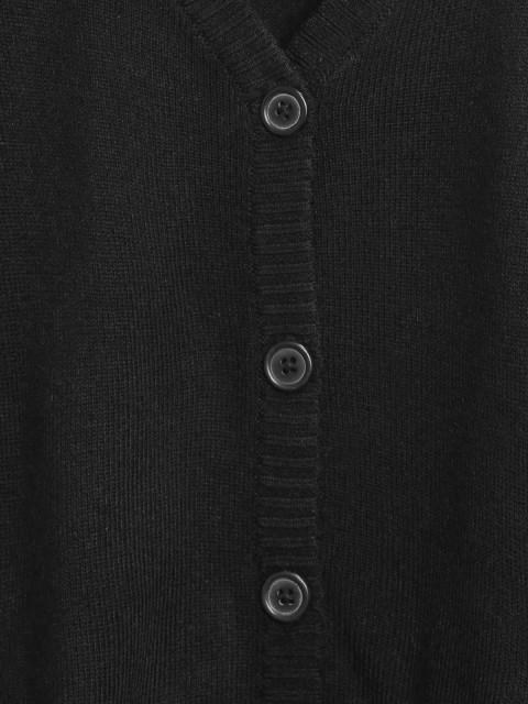 Black solid cardigan with lace inserts, has a V-neck, a full button placket, long sleeves, two pockets, ribbed hem