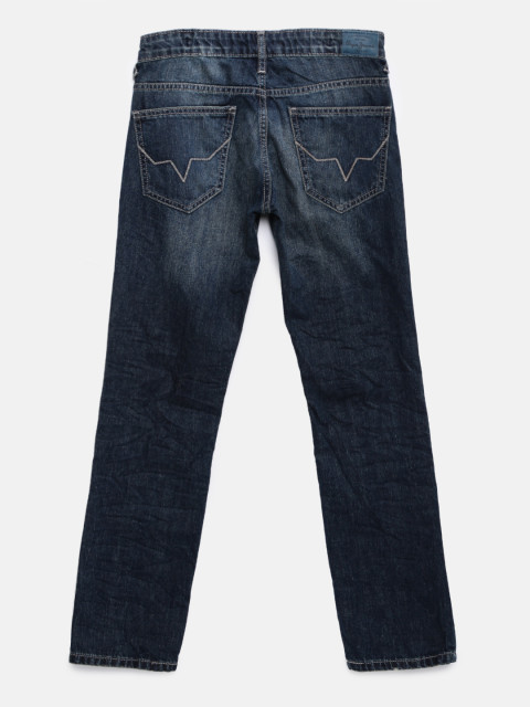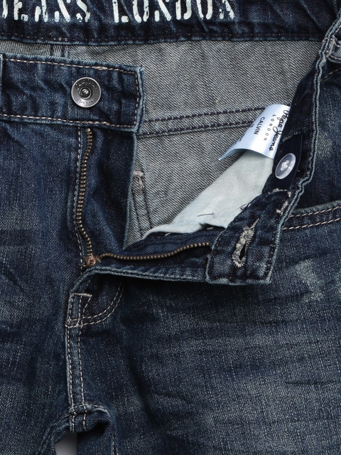Dark blue jeans, has a zip fly and button closure, four pockets, lightly distressed