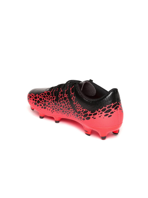 A pair of black and red football sports shoes, has lace-up detail. Synthetic printed upper, engineered with evoPOWER technology, cushioned footbed, textured and patterned outsole, engineered with DUOflex technology, has cleats. Warranty for 3 months. Warranty provided by Brand Owner or Manufacturer
