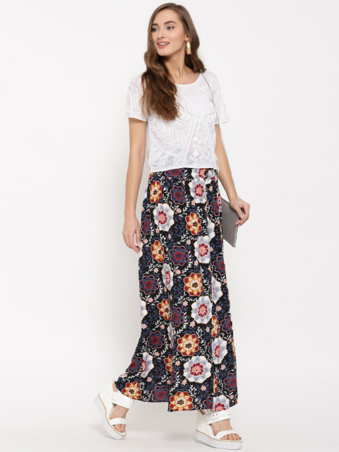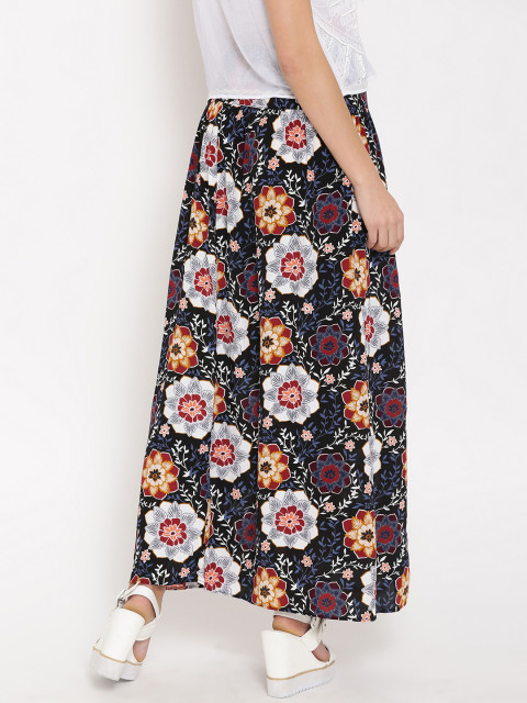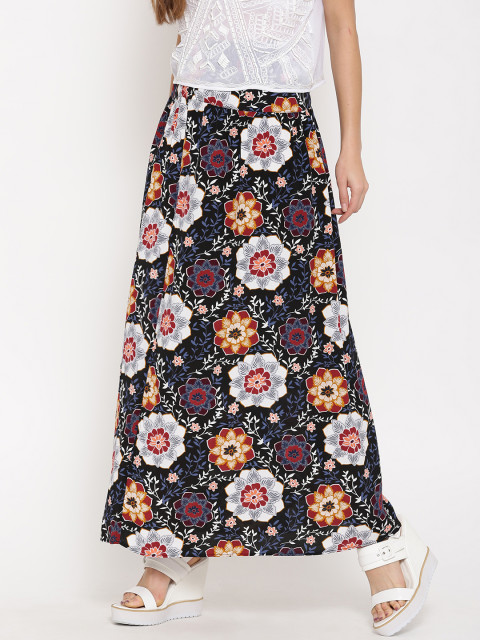 Black and white woven maxi skirt, has a waistband with a short concealed zip closure and a hook-and-eye closure on the back, a flared hem