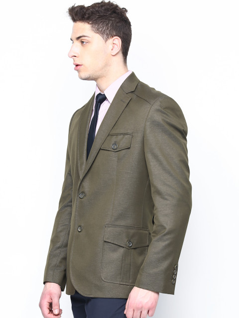 Olive green woven blazer, has a notched lapel, long sleeves with buttoned detail on the hems, single-breasted with double button closures on the front, lightly padded on the shoulders, a welt pocket with flap-and-button closure on the left side of the chest, a welt pocket with button-and-flap closures on either side of the front waist, panelled back, two slits on the back hem, and an attached lining with two built-in welt pockets on the left side, and a built-in welt pocket with flap-and-button closure on the right side