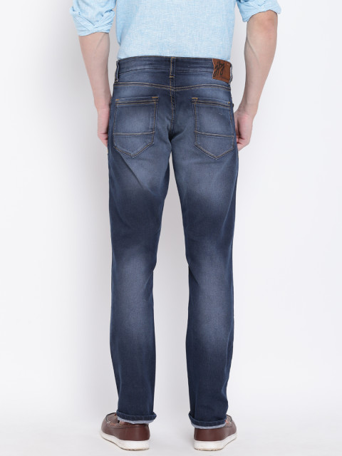 Navy blue dark wash 5 pocket mid rise jeans, clean look with light fade, has a button and zip closure, waistband with belt loops